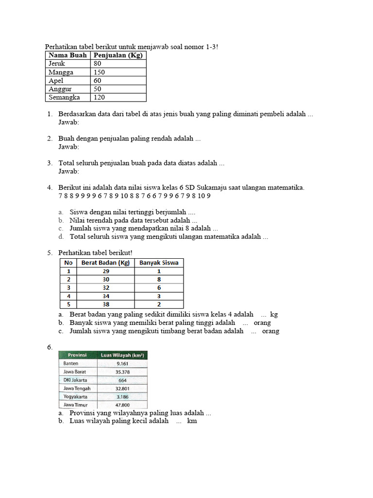 • Cari Soal yang Bervariasi: Pilihlah soal yang mencakup berbagai bentuk penyajian data (tabel, diagram batang, diagram gambar) dan jenis analisis sederhana.